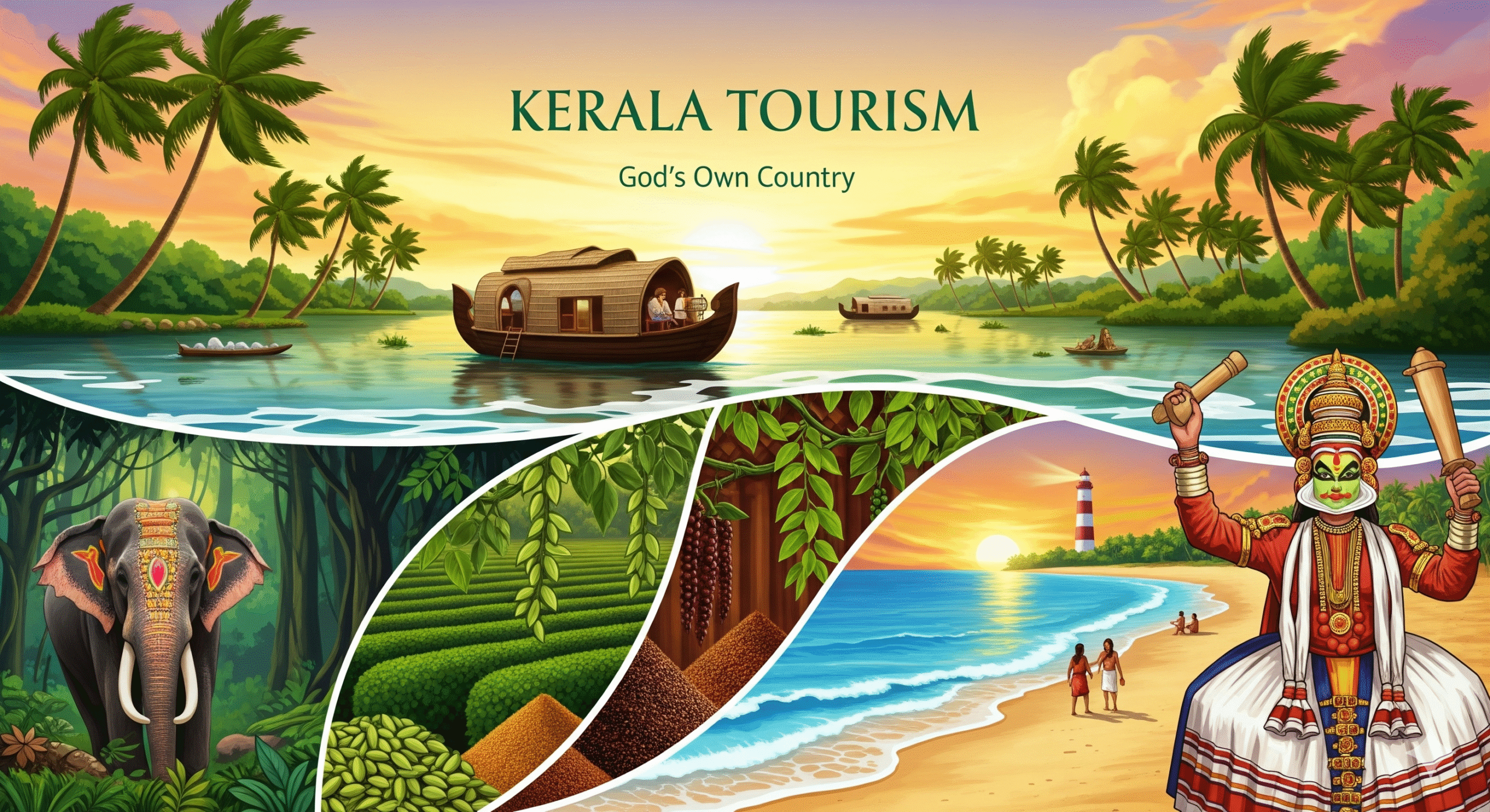 Check out Alleppey backwaters, Munnar tea gardens, and Varkala beach. Enjoy houseboat rides, spicy food, and thoda relaxation